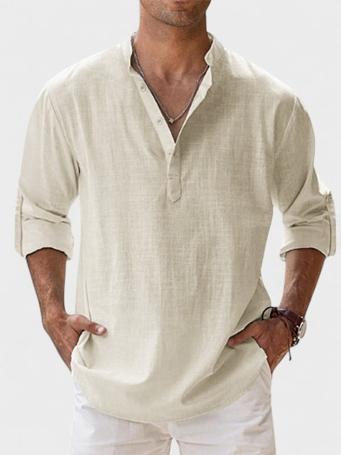 Opplev den perfekte kombinasjonen av komfort og raffinement med denne linskjorten for menn. Det avslappede snittet med V-hals og knapper gir skjorten et moderne og elegant uttrykk som passer like godt til uformelle anledninger som til finere stevnemøter. Dette plagget er lett, pustende og naturlig stilig, og er det rette valget for deg som setter pris på autentisitet når du kler deg uanstrengt, men med gjennomslagskraft.